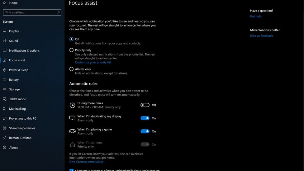 El “focus assist” o asistente de concentración es una mejora a la versión “no molestar”, que te permitía silenciar notificaciones mientras haces una determinada tarea que requiere ‘silencio’.